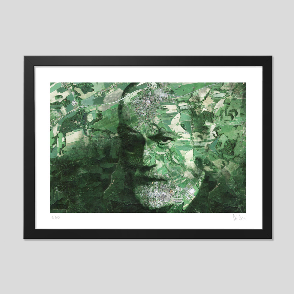 Fine art print on 350 gram matte Colorcopy paper, calendered with semi-gloss finish frame width 2cm / thickness 1.5cm. Limited edition of 100 copies, each signed and numbered, accompanied by certificate of authenticity.