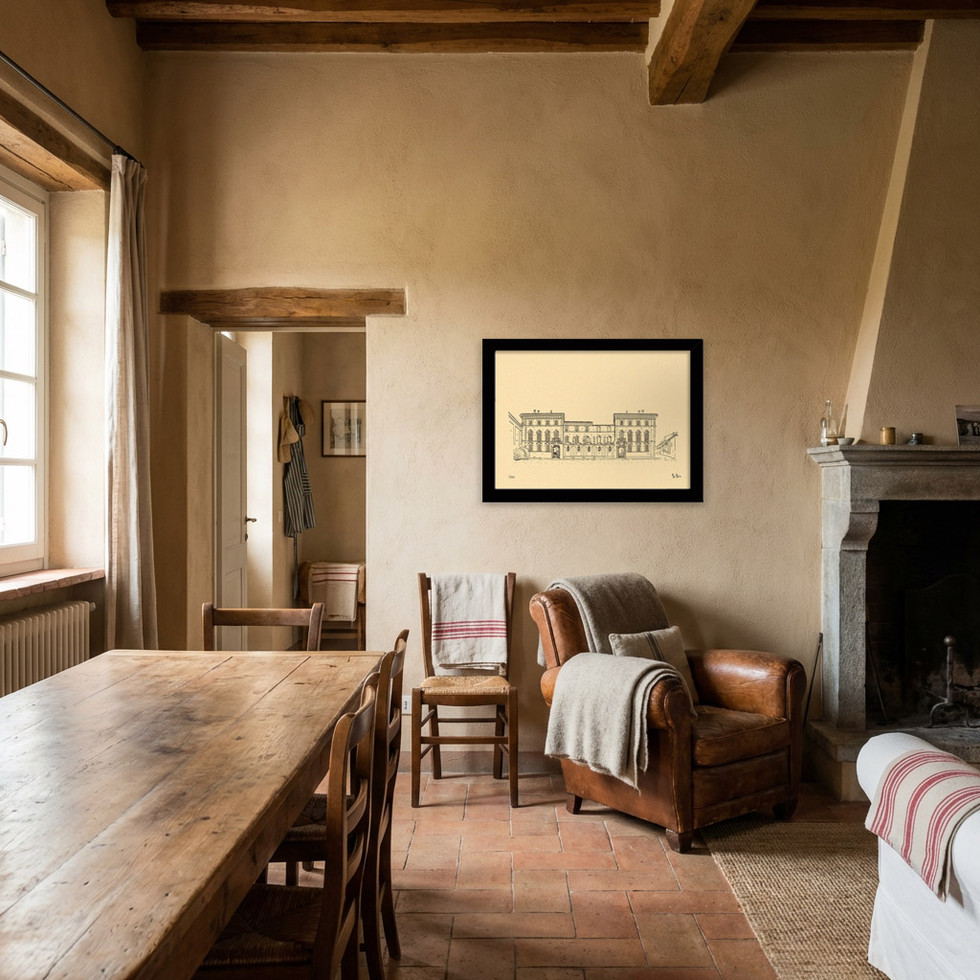 In this drawing, the profile of the building is reinterpreted through essential lines, in which the proportions and formal coherence become signs of a contemporary visual language, capable of recreating the atmosphere of a place that preserves events, memories, and style.
