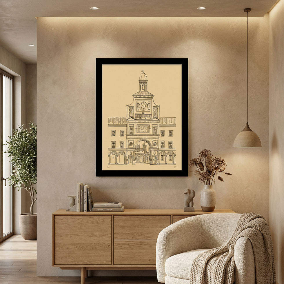 In this design, the verticality and rigorous geometry of the Torrazzo are reinterpreted through an essential and measured stroke, capable of restoring the formal strength of the building while maintaining a contemporary visual language. The graphic synthesis enhances the purity of the lines and the sharpness of the proportions, making the work suitable for both domestic and professional contexts.